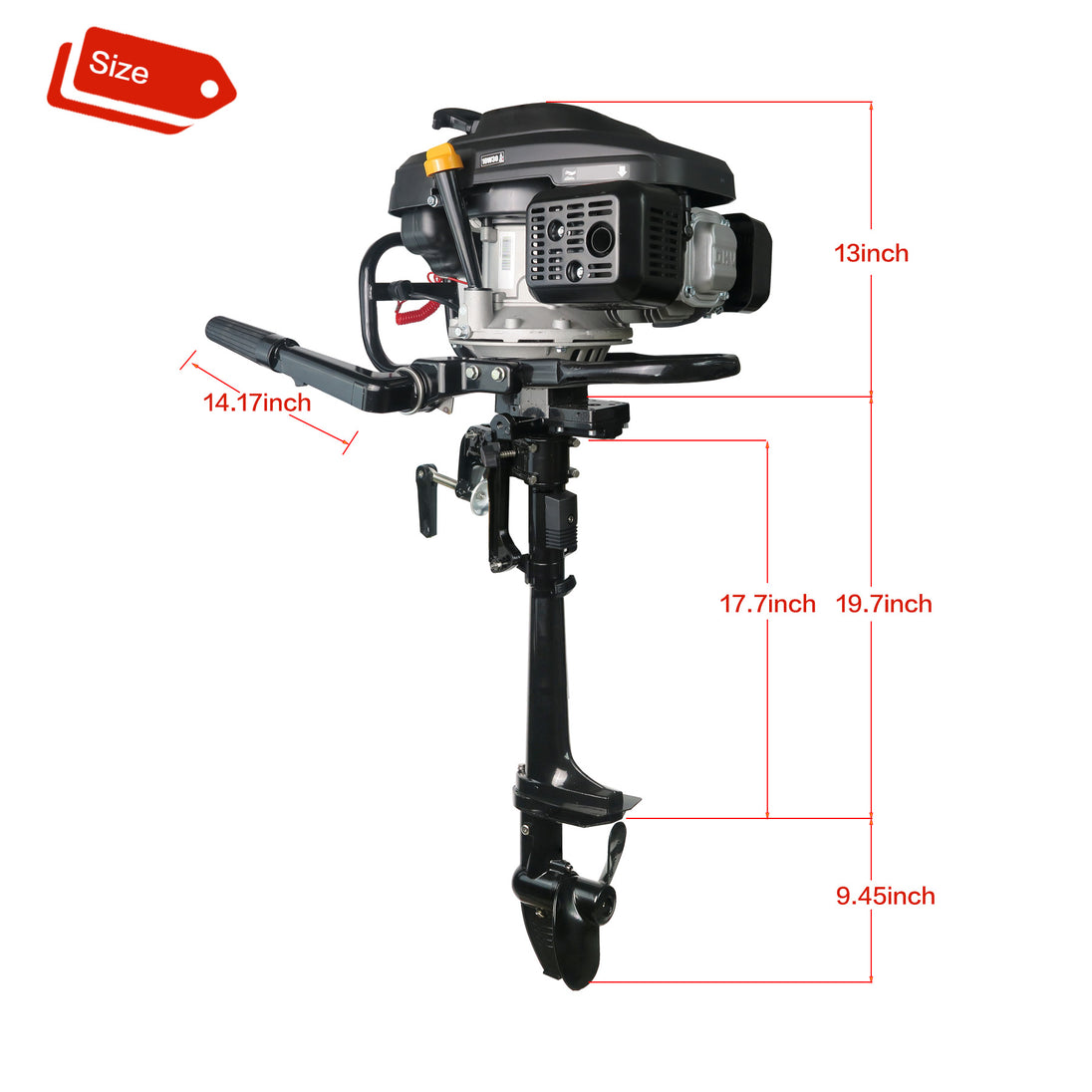- Performance: This outboard motor provides strong horsepower and superior performance, with a maximum output of 2.8kw(7.5HP) and a maximum speed of 19km/h. The engine model is 200, with a displacement of 196CC, and it features a Single cylinder horizontal, 4-stroke(OHV) engine type. The propeller size is 20cm, and the starting system is manual.
