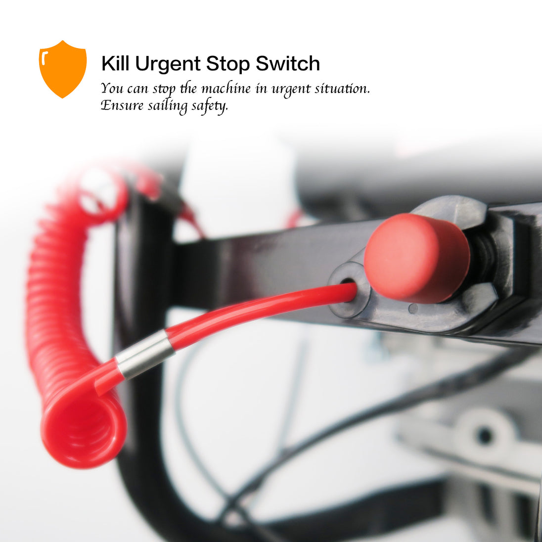- Safety features: This outboard motor is equipped with a Kill Urgent Stop Switch design and Safety Lanyard Tether Cord, providing superior safety for you and your passengers on the water. The Start-In-Gear protection/clutch feature ensures that the prop rotation is prohibited while idling, reducing the risk of accidents.